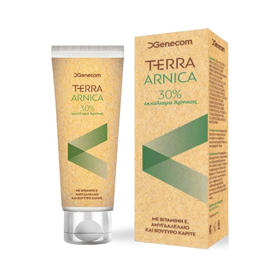 Η Genecom Terra Arnica cream 30% είναι μια κρέμα με εκχύλισμα άρνικας, βιταμίνη Ε, αμυγδαλέλαιο και βούτυρο καριτέ, για μώλωπες του δέρματος, πόνους στους μύες, τις αρθρώσεις και τους τένοντες.