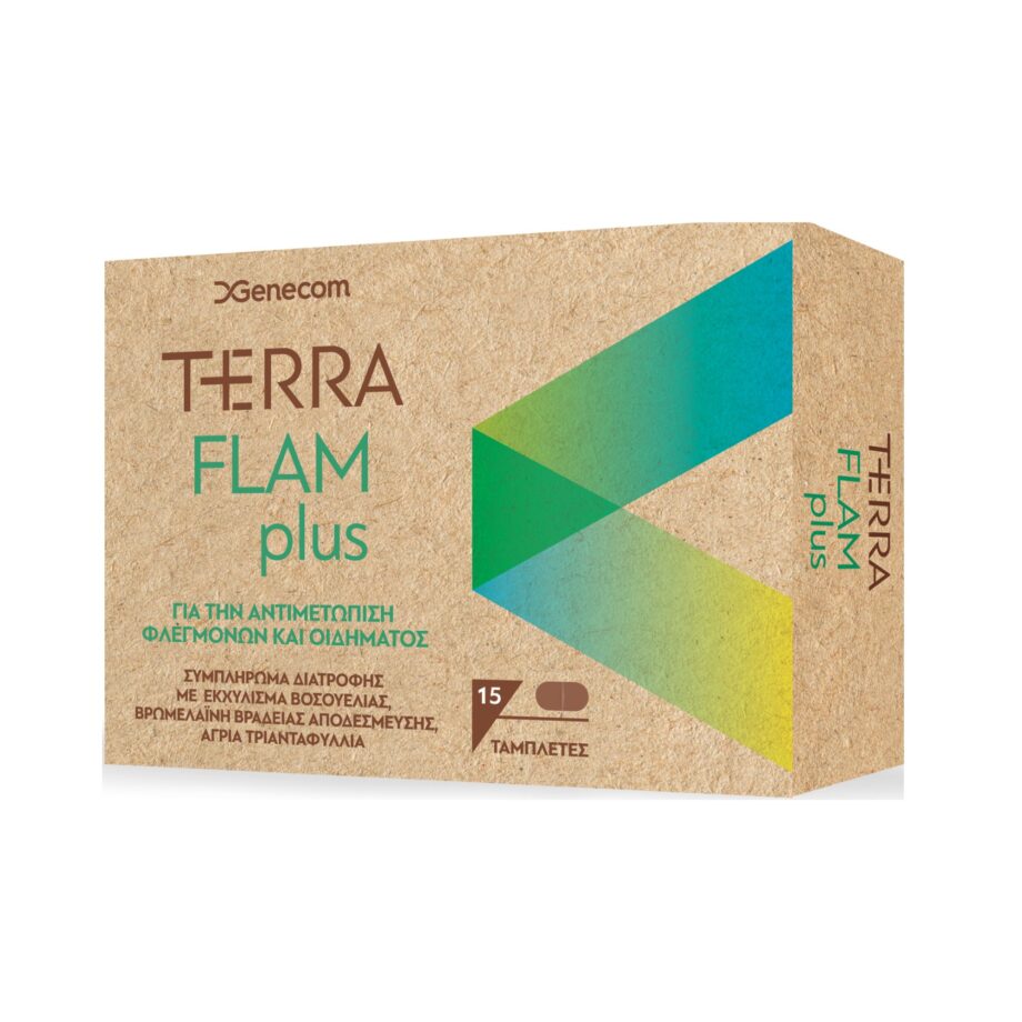 Το Genecom Terra Flam Plus είναι ένα συμπλήρωμα διατροφής με Βοσουέλια (Boswellia), Βρωμελαϊνη (Bromelain retard) και Άγρια Τριανταφυλλιά (Rosa Canina L. Fructus).