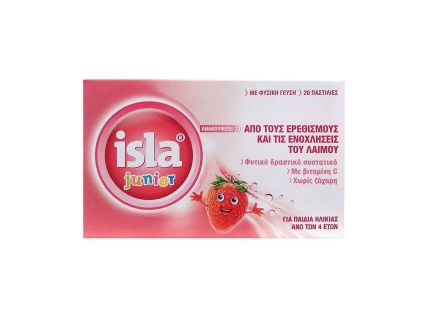 Οι παστίλιες isla junior με γεύση φράουλα προστατεύουν τους ξηρούς και ερεθισμένους βλεννογόνους του στόματος και του φάρυγγα και ανακουφίζουν από ενοχλήσεις, ερεθισμούς και βραχνάδα.
