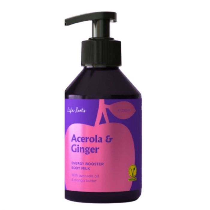 Δροσερό, ενυδατικό γαλάκτωμα σώματος, φτιαγμένο με επιλεγμένα φυσικά συστατικά που αγαπούν το δέρμα. Πλούσιο σε βιταμίνες και ιχνοστοιχεία, το γαλάκτωμα Acerola & Ginger περιποιείται το δέρμα αφήνοντας το απαλό και ενυδατωμένο. Τα έλαια καρύδας και αβοκάντο, σε συνδυασμό με τα βούτυρα καριτέ και μάνγκο χαρίζουν την απαραίτητη υγρασία και ελαστικότητα στη επιδερμίδα. Το εκχύλισμα από κεράσι, πλούσιο σε Βιταμίνη C, παρέχει αντιοξειδωτική προστασία, ενώ το εκχύλισμα ginger, χάρη στα ιχνοστοιχεία και τις βιταμίνες του, τονώνει και αναζωογονεί την επιδερμίδα. Πιστοποιημένο VEGAN προϊόν.